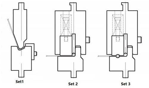 Die sets 1, 2 and 3 form the smallest curls in when the interior diameter is at least 3 times the material thickness. Die set 2 is used when an off center curl and two hits are required.
