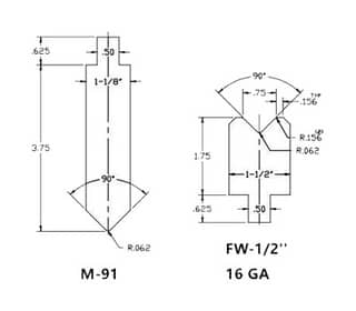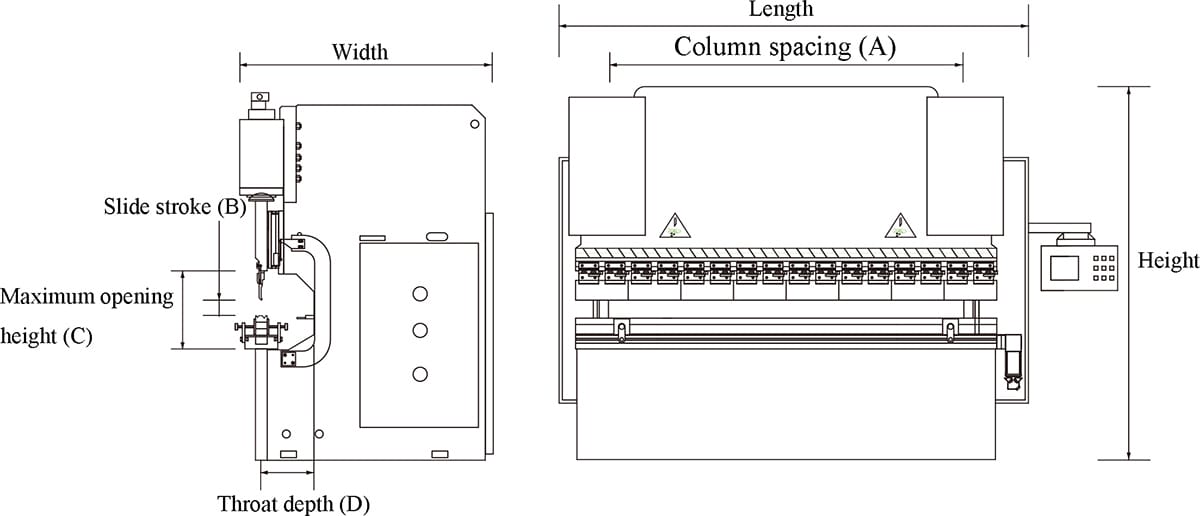 | Model | Nominal pressure (kN) | Worktable length (mm) | Column spacing (mm) (A) | Slide stroke (mm) (B) | Max. opening height (mm) (C) | Throat depth (mm) (D) | Worktable height (mm) | Rapid decent speed (mm/s) | Decent speed (slow speed mode) (mm/s) | Return speed (mm/s) | Main motor power (kW) | Oil tank capacity (L) | Backgauge X-axis stroke (mm) | Weight (T) |