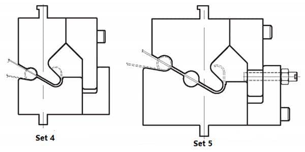 Die sets 1, 2 and 3 form the smallest curls in when the interior diameter is at least 3 times the material thickness. Die set 2 is used when an off center curl and two hits are required.